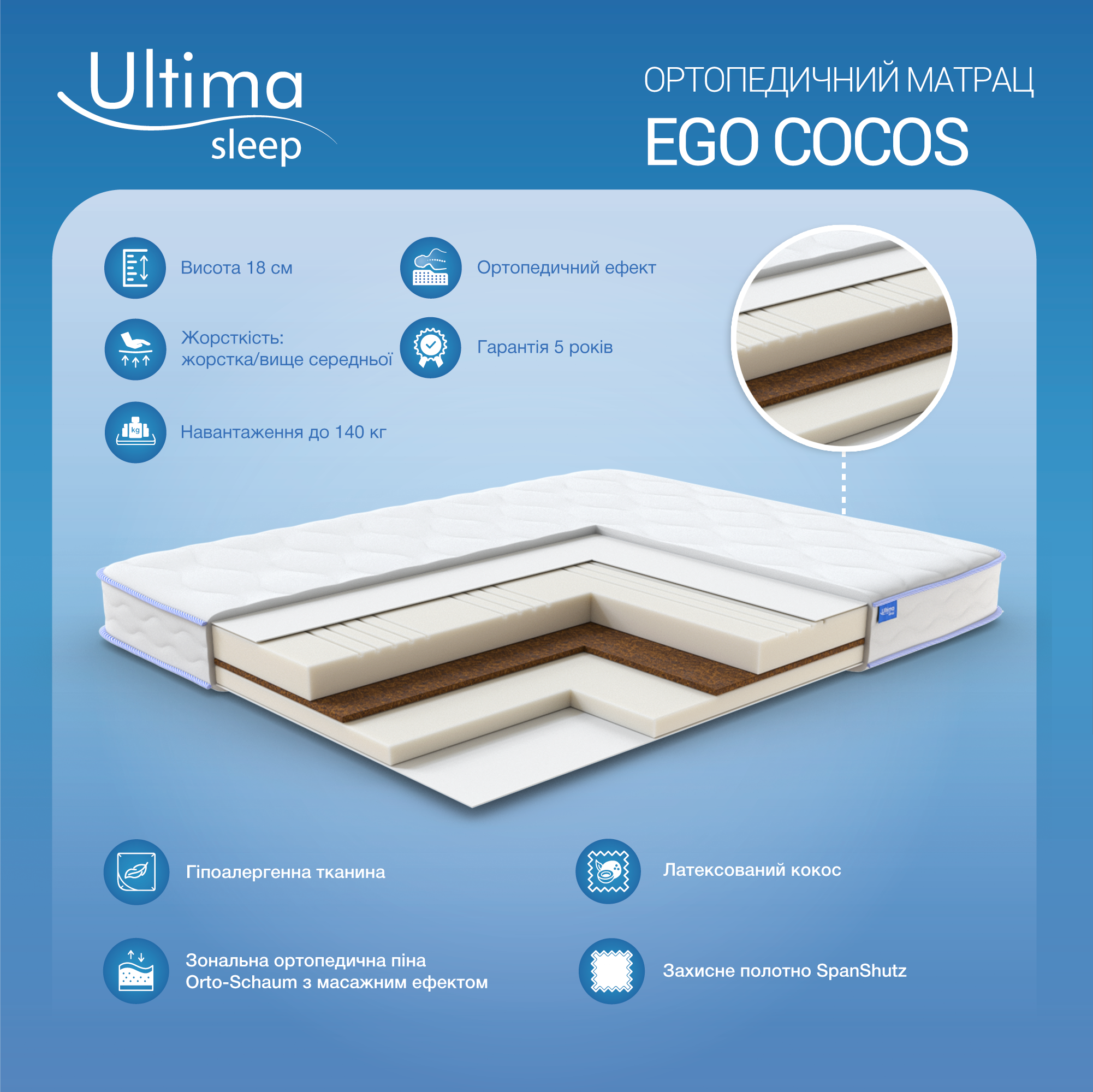 Безпружинний матрац з з двома різними рівнями підтримки, висотою 18 см.Внутрішній блок матрацу складається з шарів високоеластичної піни Ortho-Schaum та кокосової койри.